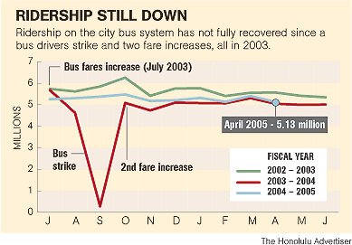 June 5, 2005. "Bus ridership still down" Mike Leidemann, Advertiser Transportation Writer,
