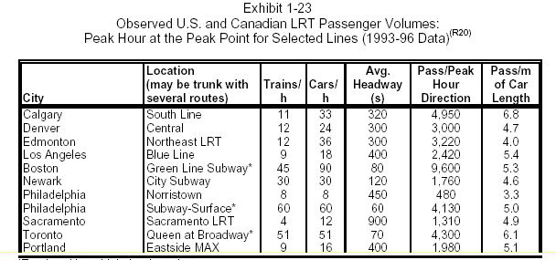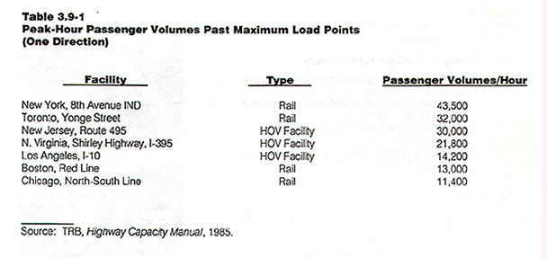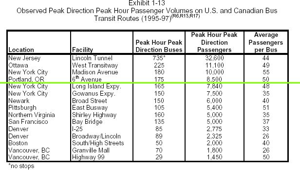 Comparing Busways with Rail Transit These tables show the actual peak hour, peak direction, passengers per hour carried by various forms or mass transit. Note from the first table that the New Jersey, Route 495 busway carries 30,000 people per hour and Washington DC's Shirley Highway carries 21,800 per hour. Compare that with other U.S. heavy rail where only New York's 8th Avenue line carries more people per hour. Light rail does not even come close to that of busways. |
